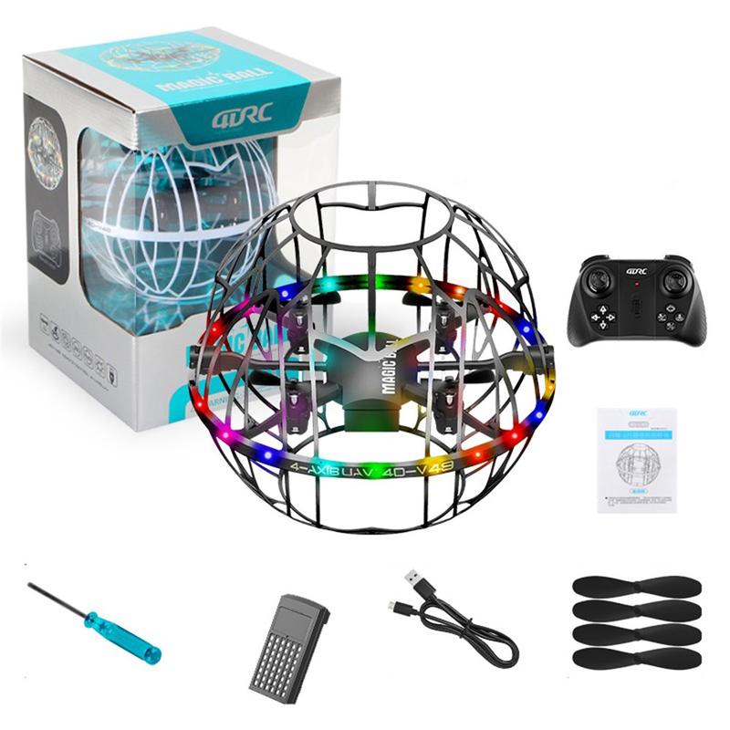 El dron 4DRC 4D-V49 con forma de balón de fútbol está diseñado para realizar vuelos seguros y entretenidos en interiores y exteriores. Su jaula protectora esférica rodea las hélices, lo que ayuda a reducir el riesgo de impacto a la vez que lo hace apto para el juego de niños y familias.