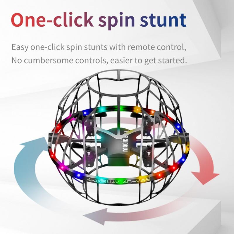 El dron 4DRC 4D-V49 con forma de balón de fútbol está diseñado para realizar vuelos seguros y entretenidos en interiores y exteriores. Su jaula protectora esférica rodea las hélices, lo que ayuda a reducir el riesgo de impacto a la vez que lo hace apto para el juego de niños y familias.