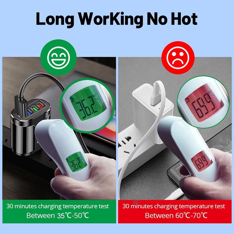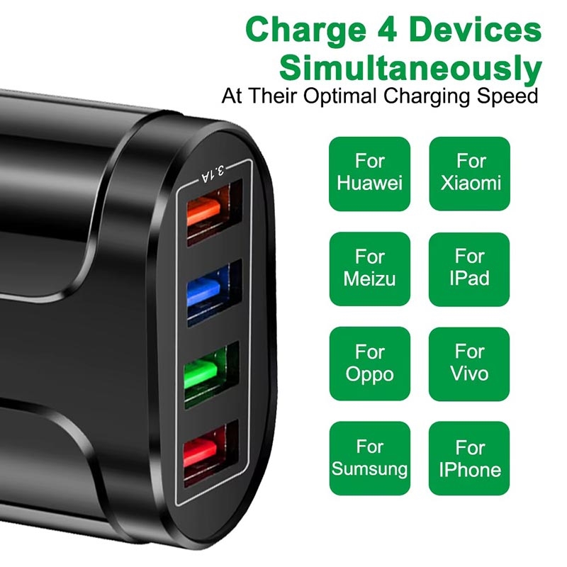 Gracias al chip inteligente integrado, el adaptador de corriente USB universal de 4 puertos carga sus dispositivos de forma más rápida y estable. Está equipado con 4 puertos de salida USB, por lo que puede cargar rápidamente hasta cuatro dispositivos simultáneamente. Debido a su tamaño ligero y compacto, puede llevarlo a todas partes.