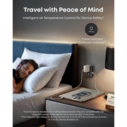Uno de los puertos USB-C ofrece una carga rápida de 20W, capaz de cargar un iPhone 16 al 50% en sólo 28 minutos. A pesar de sus potentes características, el adaptador sigue siendo increíblemente compacto -un 43% más pequeño que los modelos tradicionales- e incluye clavijas plegables y retráctiles para una máxima portabilidad. El control de temperatura inteligente integrado mejora la seguridad, mientras que su estructura de 2 clavijas a 2 clavijas proporciona un rendimiento resistente a los golpes para mayor tranquilidad.
