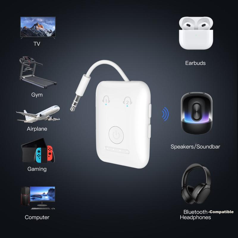 Los transmisores Bluetooth están diseñados para enviar audio desde fuentes que no son Bluetooth (como televisores o pantallas de aviones) a tus auriculares inalámbricos. Bluetooth 5.3 ofrece una estabilidad y eficiencia mejoradas en comparación con versiones anteriores. Los transmisores de doble conexión son populares para viajar, ya que permiten compartir la escucha sin necesidad de divisores ni cables adicionales.