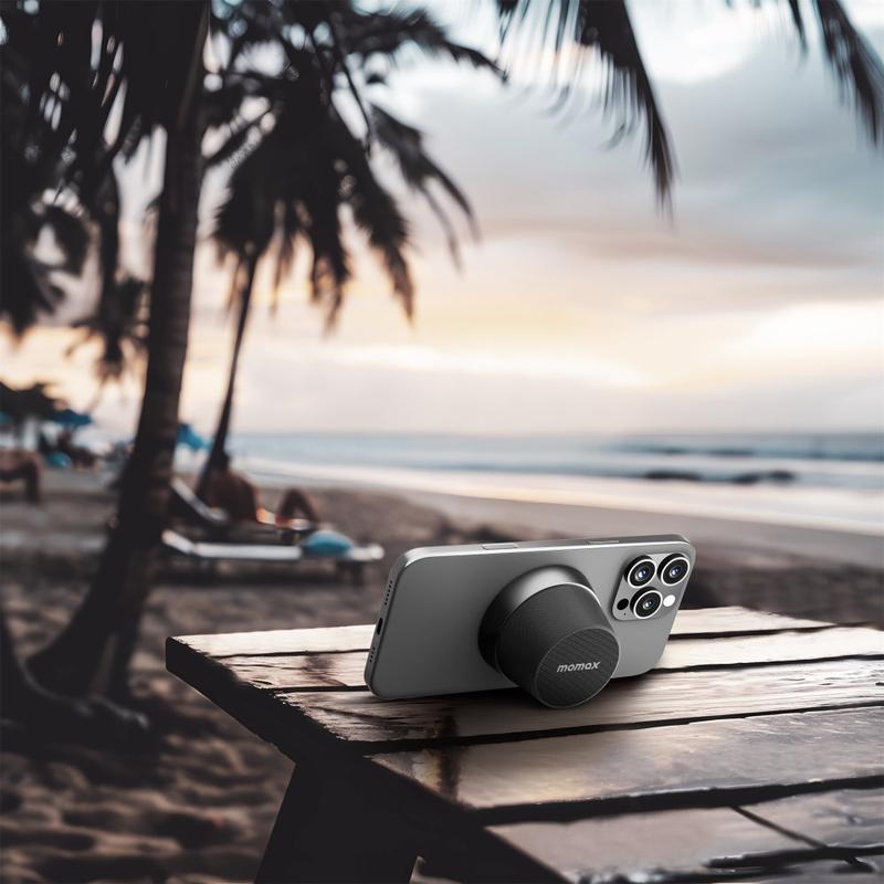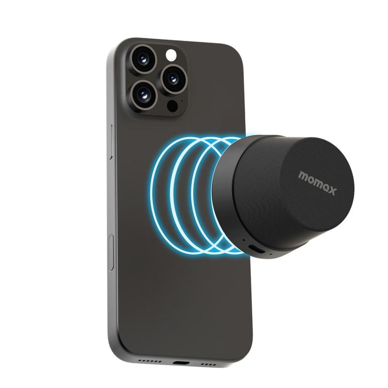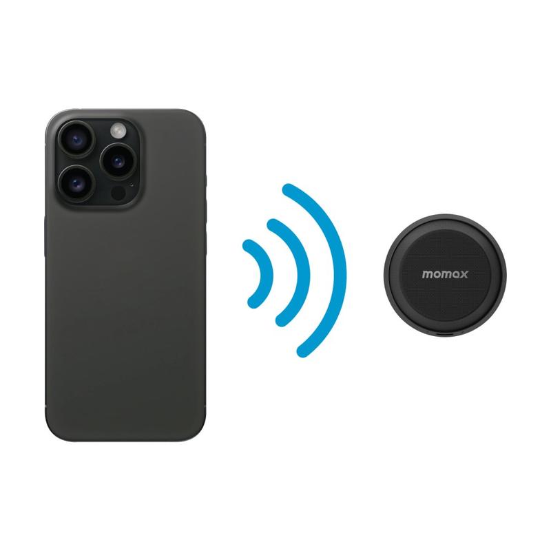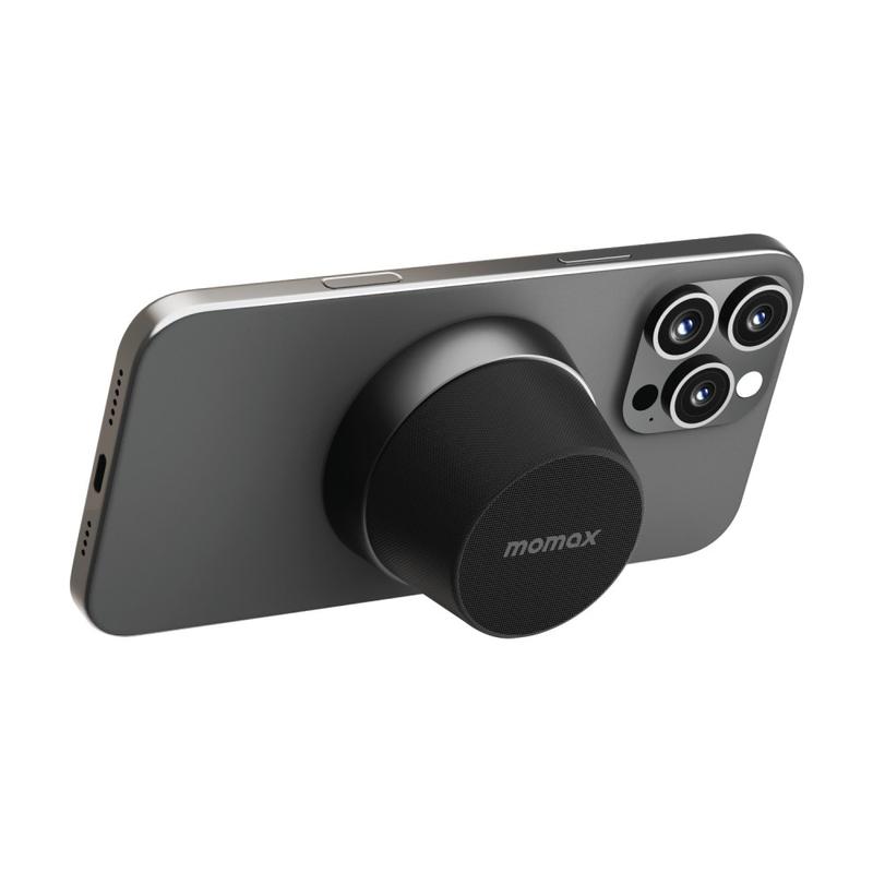 • Altavoz Bluetooth magnético mini Momax 1-Vibe Go BS6 y soporte para teléfono, sonido 360° y resistencia al agua IPX6