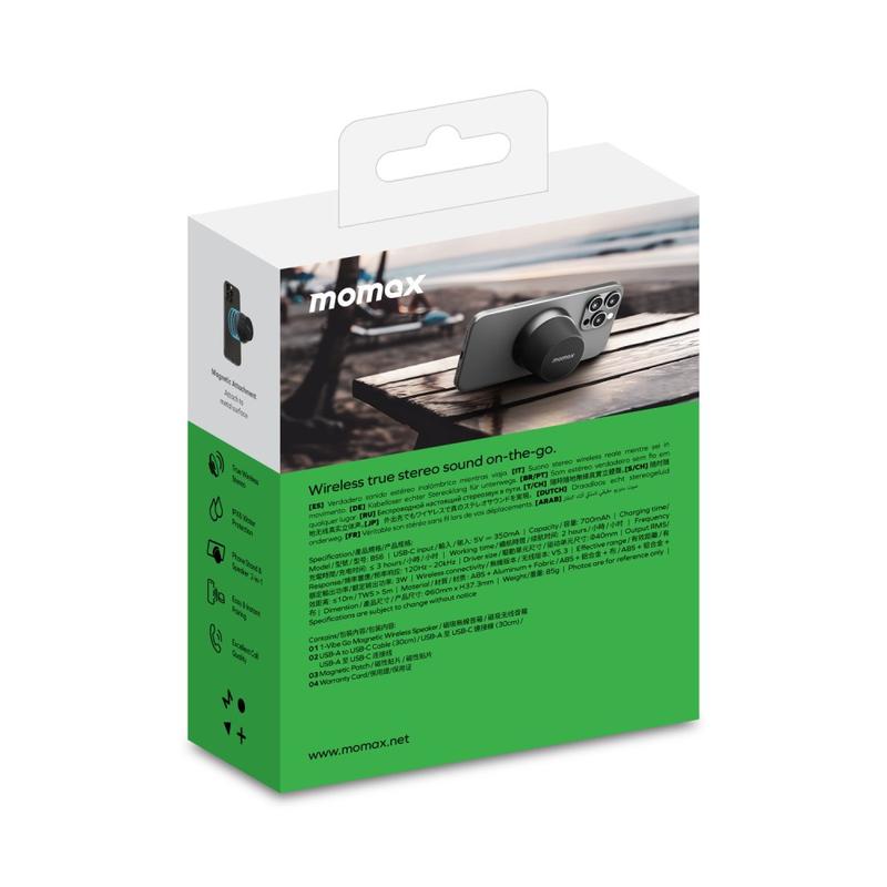 El mini altavoz Bluetooth magnético MOMAX 1-Vibe Go BS6 es una solución de audio compacta y versátil diseñada para el entretenimiento diario en casa o fuera de ella. Su diseño magnético ultramini combina un altavoz inalámbrico portátil con un práctico soporte para el teléfono, lo que le permite disfrutar de música, vídeos y llamadas con facilidad. Equipado con un potente controlador de 40 mm y una salida de sonido de 360°, ofrece un audio envolvente en un formato sorprendentemente pequeño, mientras que su resistencia al agua IPX6 lo hace adecuado para el uso diario en diferentes entornos.
