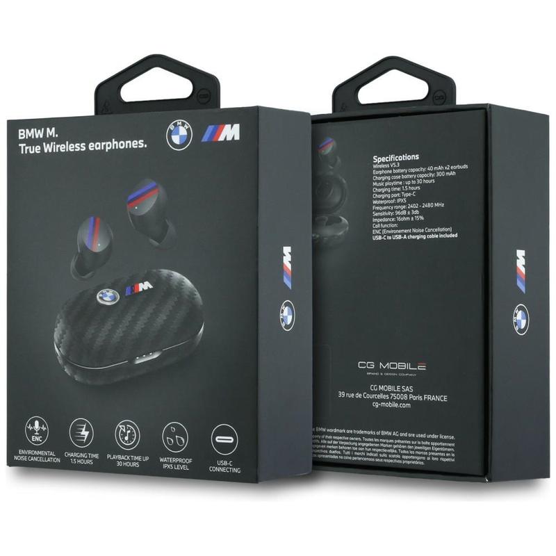 • Auriculares inalámbricos BMW M Carbon ENC: Bluetooth 5.3, IPX5, hasta 30 horas de reproducción, estuche USB-C