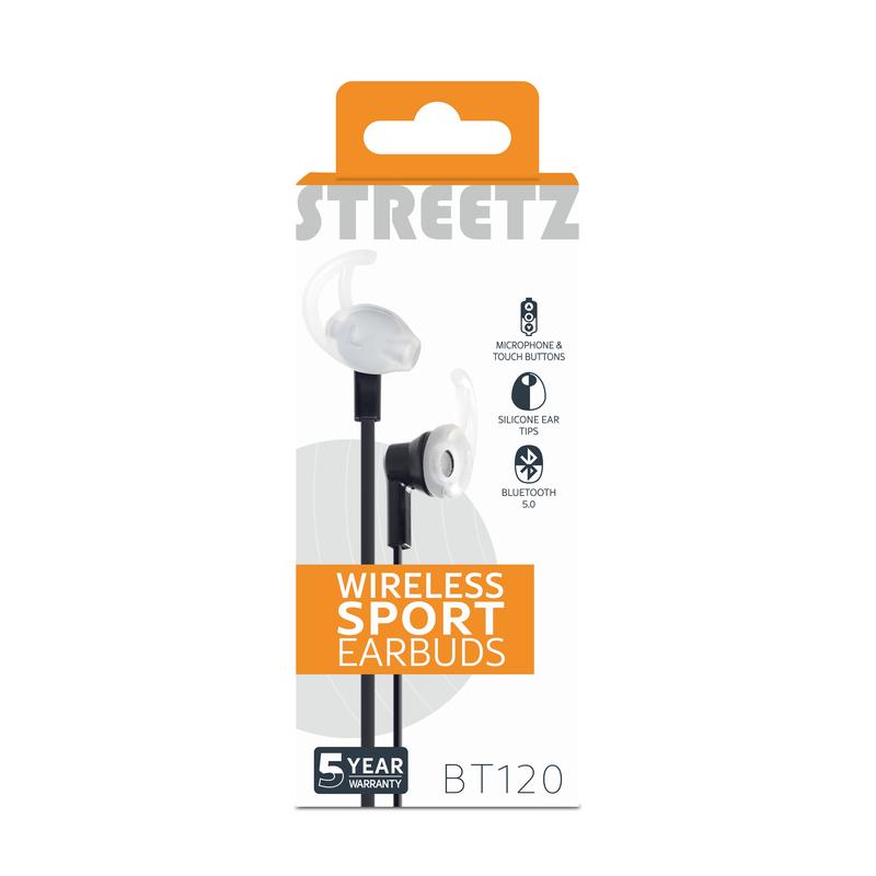 Auriculares Bluetooth Streetz Stay-in-Ear con micrófono: auriculares deportivos inalámbricos con botones multimedia/llamadas, Bluetooth 5 y cable de 1,2 m