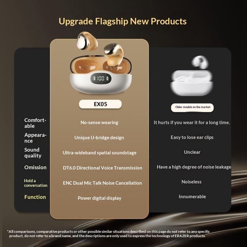 Disfruta de una escucha cómoda en tu día a día con los auriculares inalámbricos con clip ERAZER EX05. Diseñados con una forma ligera de clip y oído abierto, estos auriculares inalámbricos se ajustan cómodamente sin ejercer presión en el conducto auditivo, lo que los convierte en una opción práctica para practicar deporte, pasear, desplazarse al trabajo y el uso diario.