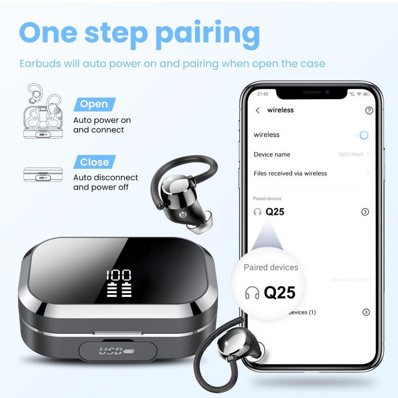 Los auriculares inalámbricos Q25 están pensados para usuarios que buscan un ajuste más seguro, una batería práctica y una experiencia auditiva flexible para el día a día, todo ello en un diseño compacto. Gracias a su diseño ergonómico con gancho para la oreja, se mantienen cómodamente en su sitio durante el ejercicio, los desplazamientos, los paseos y el uso diario, mientras que el estuche de carga incluido aporta una comodidad adicional con su función de batería externa integrada. Esto convierte a los Q25 en una opción inteligente para quienes buscan algo más que unos auriculares inalámbricos estándar.