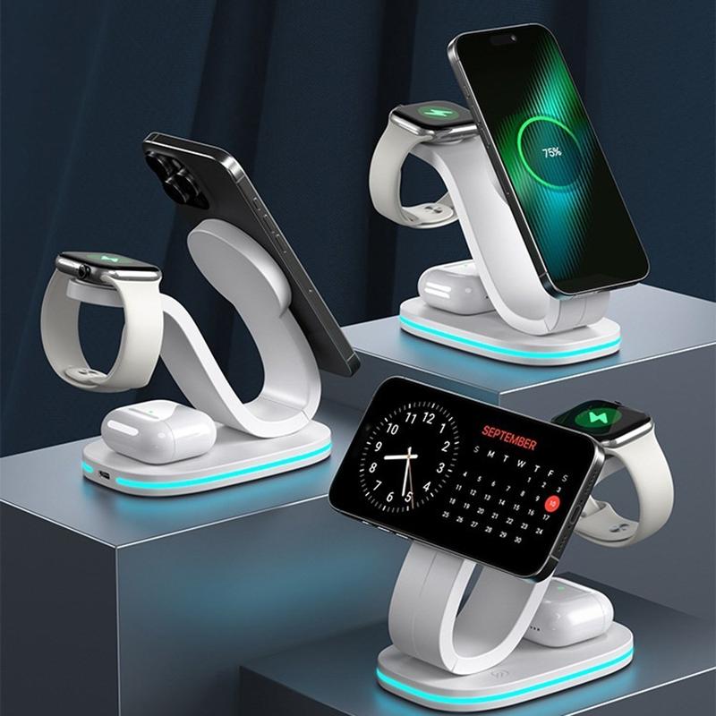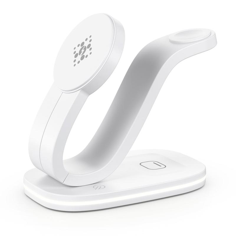 Elimina el desorden del escritorio con un único soporte que proporciona una carga inalámbrica rápida de 15 W, carga tu reloj inteligente a 2 W, alimenta tus auriculares a 3 W y funciona como una suave luz nocturna.