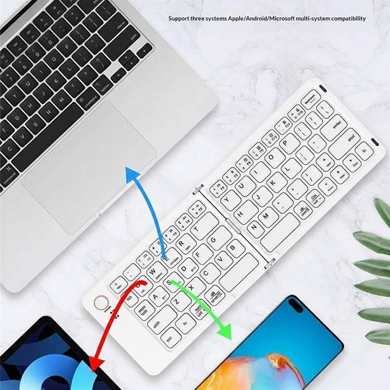 El teclado inalámbrico plegable magnético B023 de 68 teclas está diseñado para personas que trabajan y escriben mientras se desplazan. Gracias a su inteligente diseño magnético plegable doble, el teclado se pliega hasta alcanzar un tamaño ultrafino y compacto que cabe fácilmente en un bolso o incluso en un bolsillo grande. Con una amplia compatibilidad Bluetooth para teléfonos, tabletas y ordenadores portátiles, convierte cualquier lugar en un espacio de trabajo productivo en cuestión de segundos.