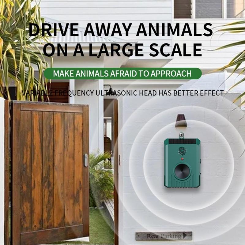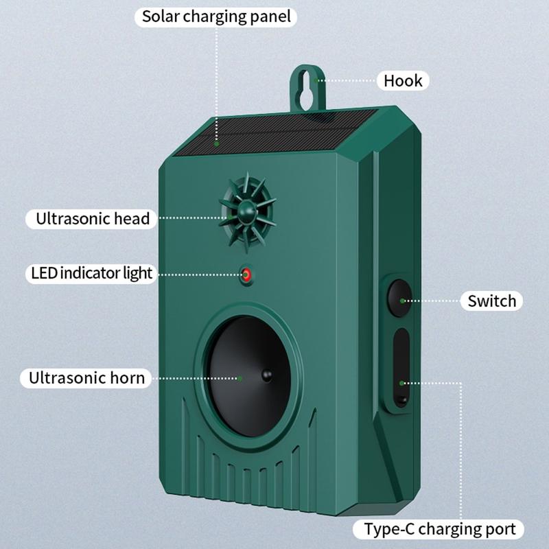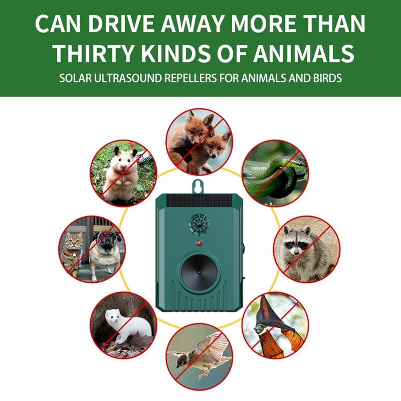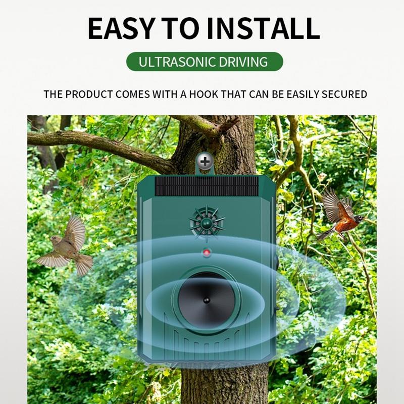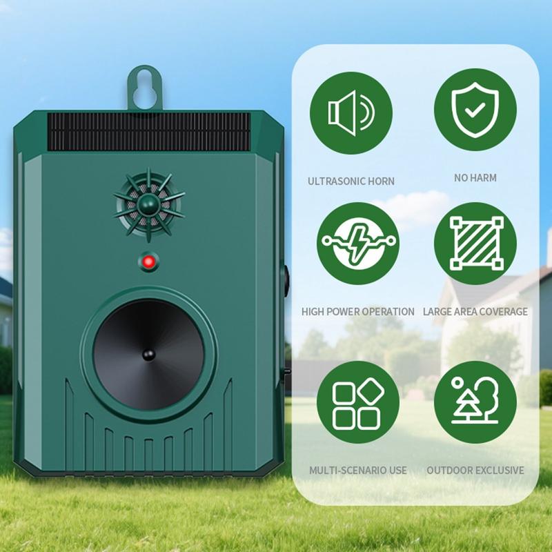 Combinando ondas ultrasónicas (8-35KHz) con sonido audible, el dispositivo disuade eficazmente a pájaros, roedores, murciélagos, perros, ardillas y otros animales salvajes. El diseño de doble acción aumenta la tasa de éxito repelente a través de una gama más amplia de plagas.