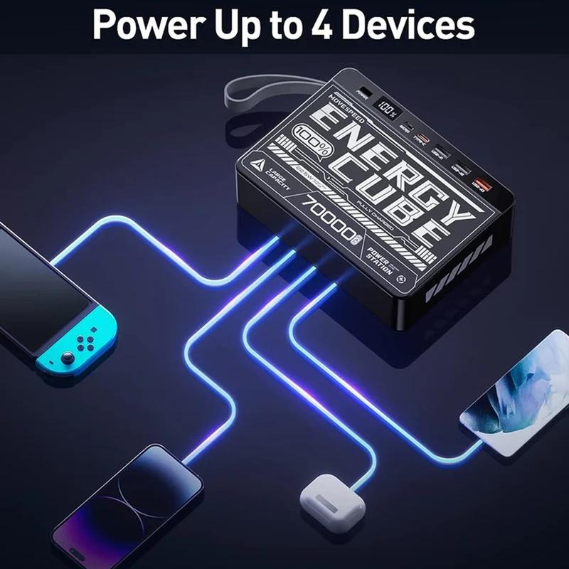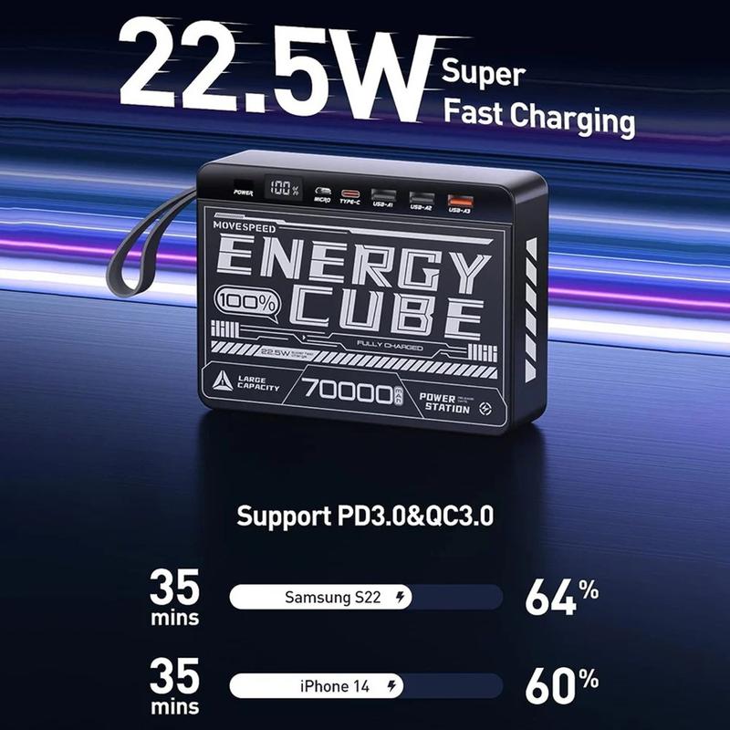 Cárgalo todo en cualquier lugar con la batería portátil Movespeed YSPBZ70-22K, un cargador portátil de 70000mAh de gran capacidad diseñado para ofrecer la máxima resistencia y velocidad. Con varios puertos de carga rápida y un atrevido diseño inspirado en las mechas, está diseñado para mantener tus dispositivos cargados durante días, ya estés de acampada, de viaje o trabajando a distancia.