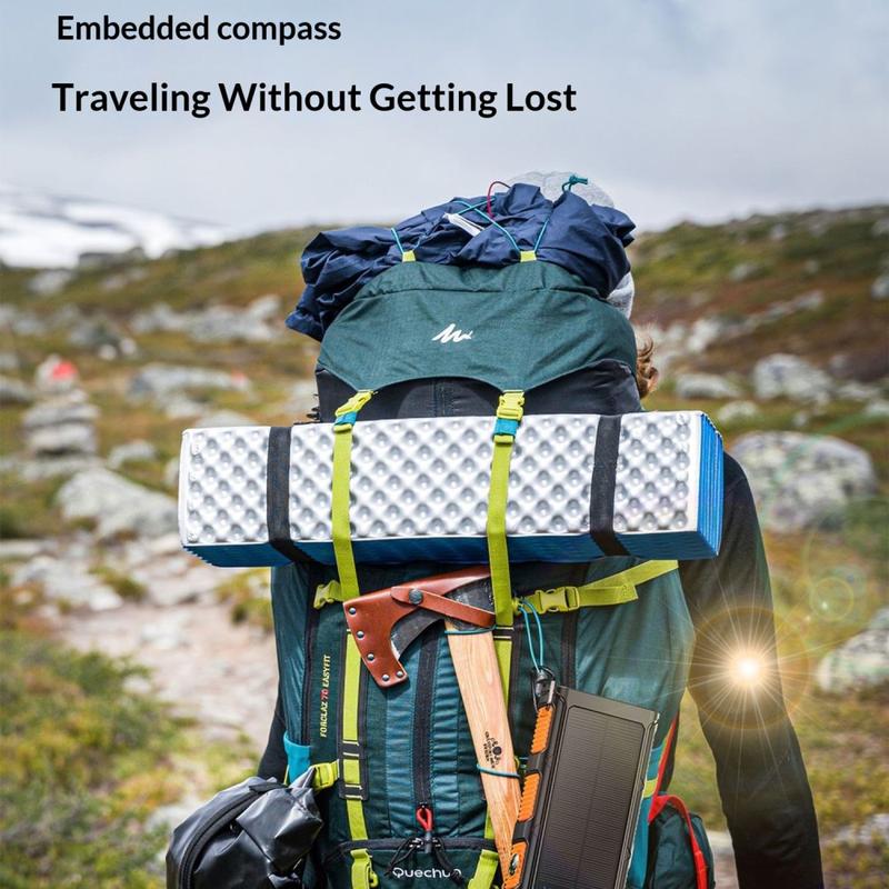 La batería de alta capacidad de 30000mAh admite múltiples ciclos de carga para teléfonos, pequeños dispositivos y otros aparatos de uso diario. También cuenta con carga rápida PD de 20 W, dos puertos de salida y cables integrados de tipo C, micro-USB y Lightning, para que puedas cargar tus dispositivos de forma más cómoda sin tener que llevar cables adicionales. Para mayor practicidad al aire libre, incluye una linterna LED brillante, alarma SOS y brújula.