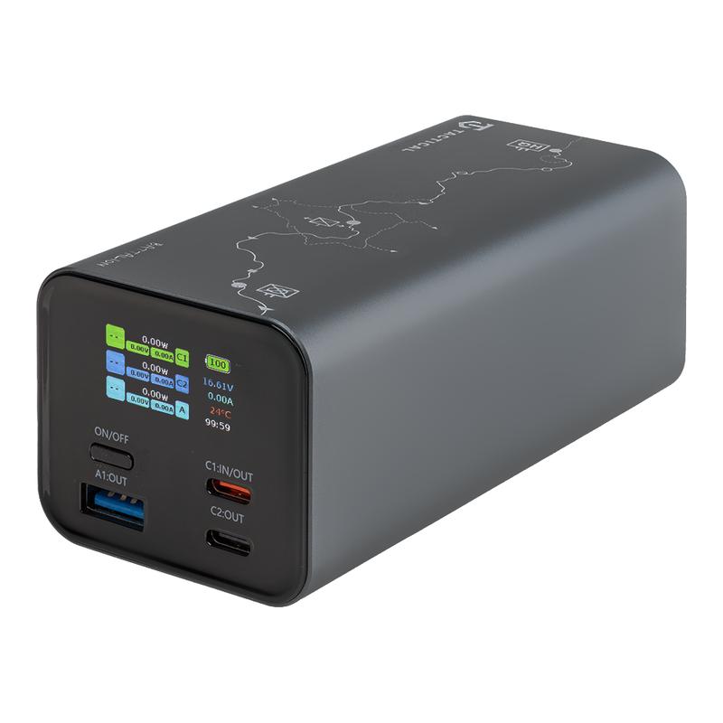 Con 2 puertos USB-C y 1 puerto USB-A, ofrece una carga flexible para varios dispositivos a la vez. La pantalla TFT integrada muestra el nivel de batería, el estado de carga y la potencia de entrada o salida en tiempo real, para que siempre sepas exactamente cuánta energía te queda. La carcasa íntegramente de aleación de aluminio aporta durabilidad, una mejor disipación del calor y un tacto de alta calidad, mientras que el distintivo patrón de inspiración táctica le confiere un aspecto atrevido y moderno.