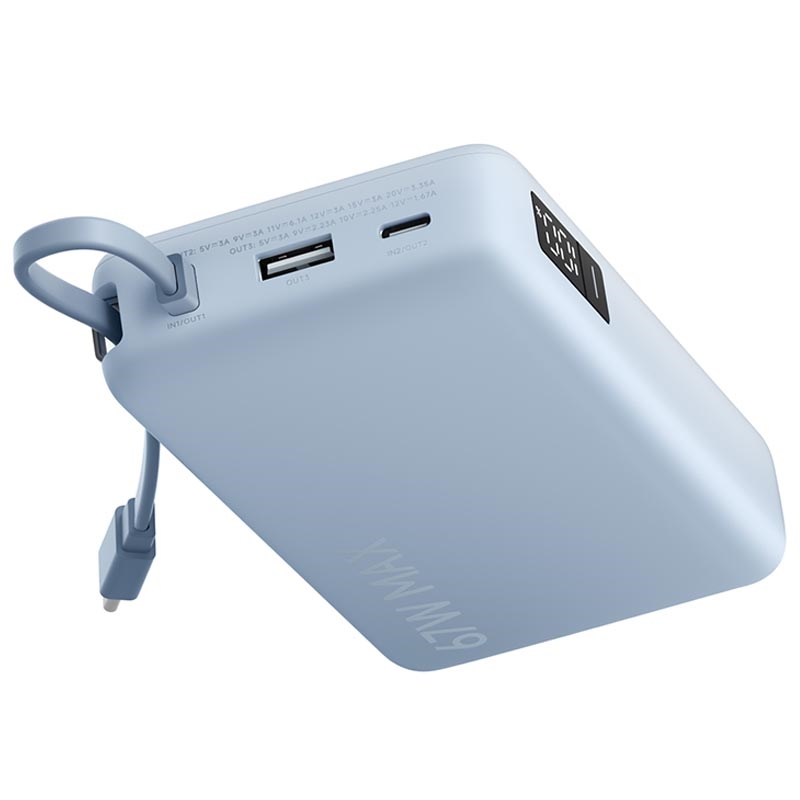 Este cargador portátil es ideal si quieres una carga rápida con un diseño apto para viajar. La salida de 67W cubre más que solo teléfonos, la recarga de 65 W reduce el tiempo de inactividad y el cable USB-C integrado facilita su transporte y uso en cualquier lugar. Añádele la pantalla digital clara y la carga multipuerto, y obtendrás una solución de energía fiable para el trabajo, los viajes y el uso diario.