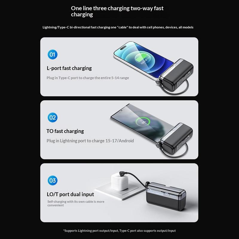 Tanto el puerto USB-C como el USB-L admiten la carga bidireccional, lo que permite que el propio cargador portátil se recargue rápidamente al tiempo que ofrece opciones flexibles de carga de dispositivos. Puede admitir la carga de más de un dispositivo según tus necesidades de uso, lo que lo hace útil para personas que llevan varios dispositivos durante el día. Esta flexibilidad añadida contribuye a convertirlo en un accesorio de carga portátil más versátil.