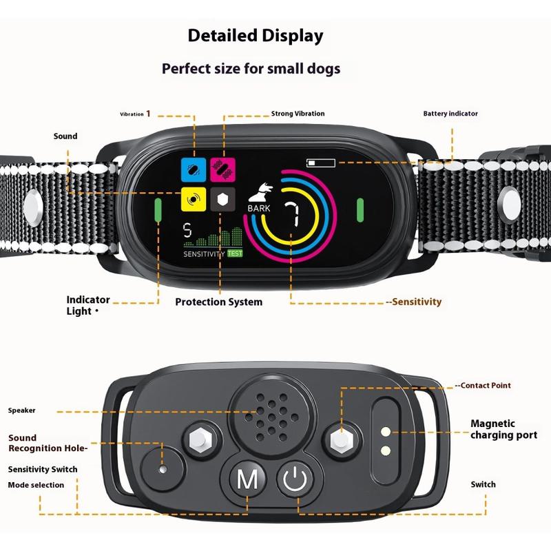 Construido con un sistema inteligente de reconocimiento de voz del perro, el collar diferencia entre el ladrido de su perro y otros ruidos para evitar falsos disparos. Un modo de reposo automático garantiza la comodidad de su perro y evita la sobreestimulación durante el adiestramiento.