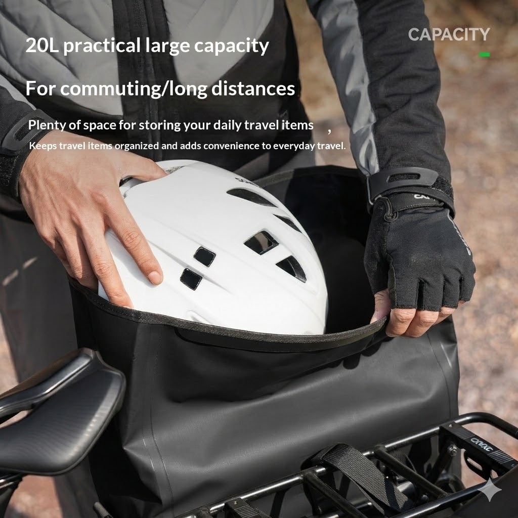 Lleva tus objetos esenciales con mayor comodidad en cada salida con la alforja trasera ROCKBROS AS-166. Diseñada para desplazamientos diarios, excursiones y el ciclismo cotidiano, esta versátil alforja de 20litros combina una capacidad práctica con una protección fiable contra las inclemencias del tiempo. Su diseño con cierre enrollable te permite ajustar el tamaño de la bolsa en función de tu carga, lo que la hace tan útil para los recados diarios como para las salidas más largas de fin de semana.
