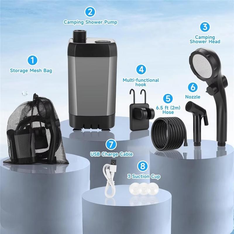 - Bomba de ducha eléctrica portátil para acampada, viajes, uso en la playa, lavado de mascotas y limpieza al aire libre