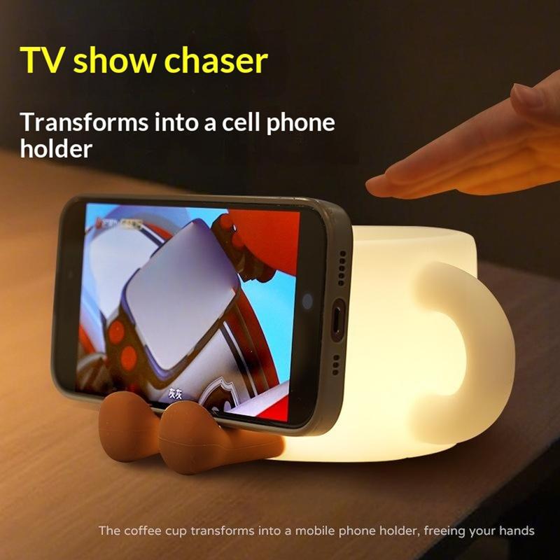 Bonita lámpara nocturna con forma de taza de café y soporte para teléfono: lámpara LED con control táctil y 7 colores, 3 niveles de brillo cálido, temporizador de 30 minutos y recargable mediante USB-C