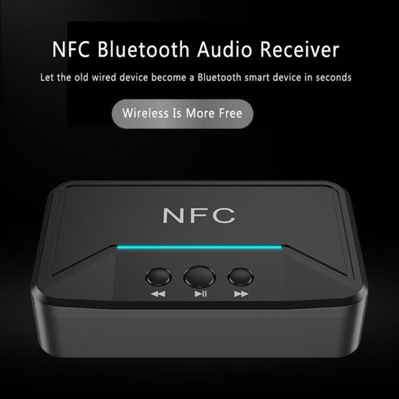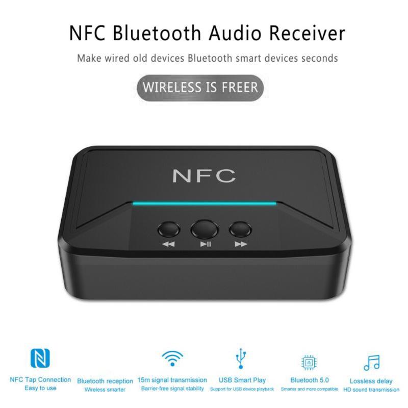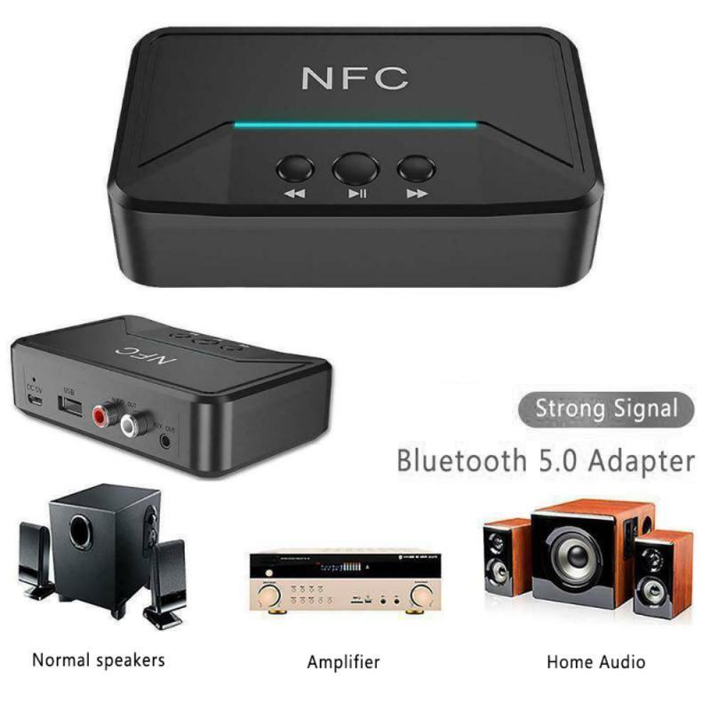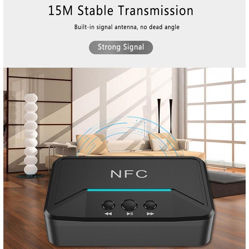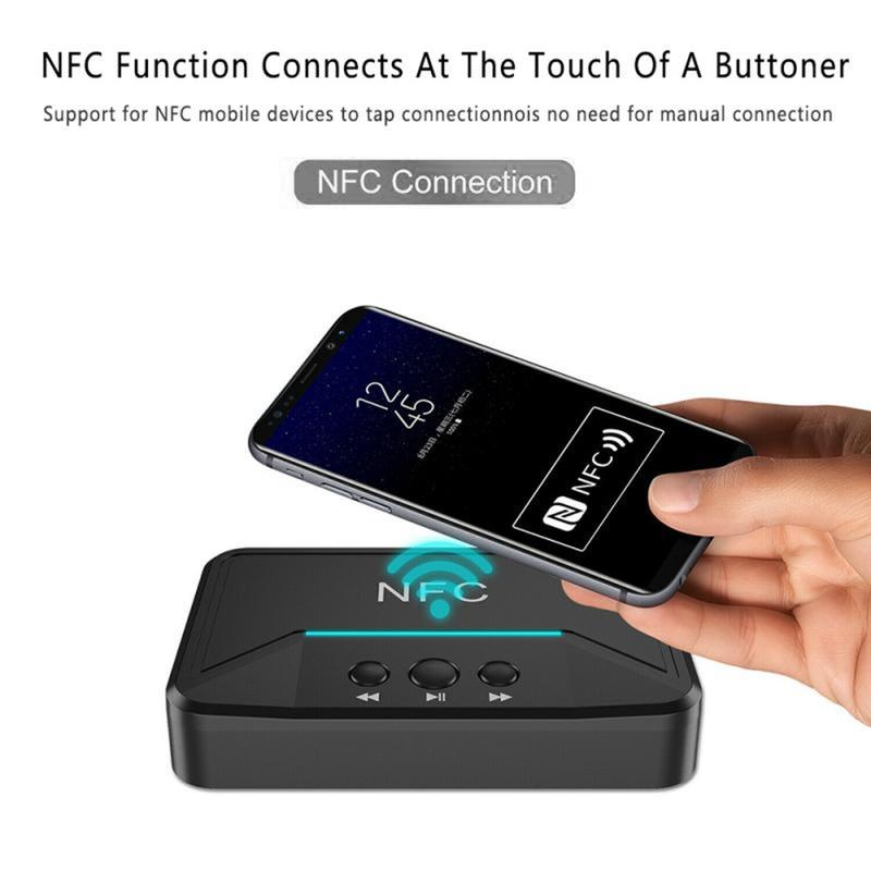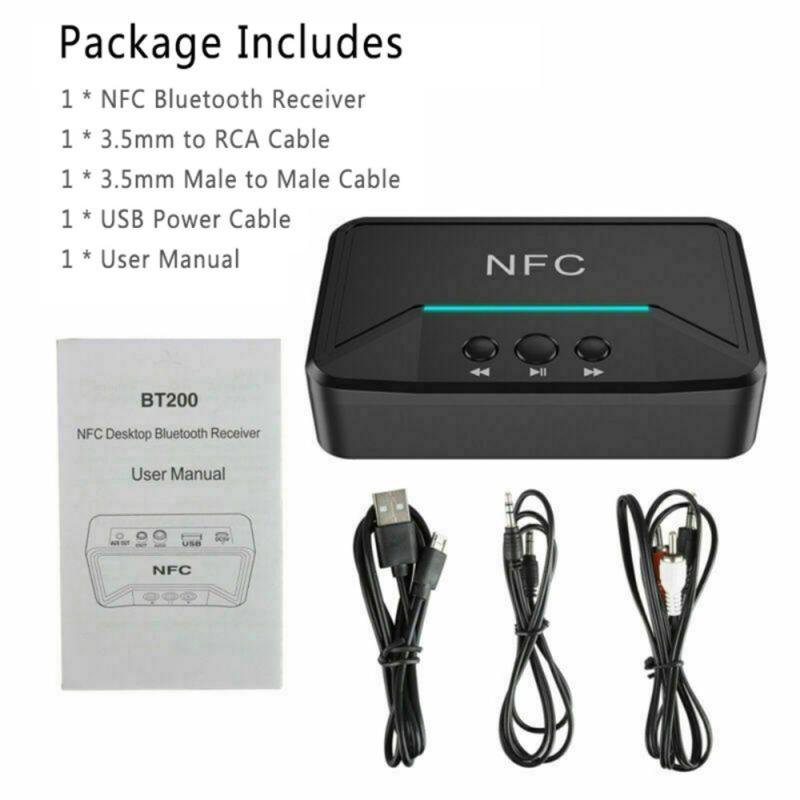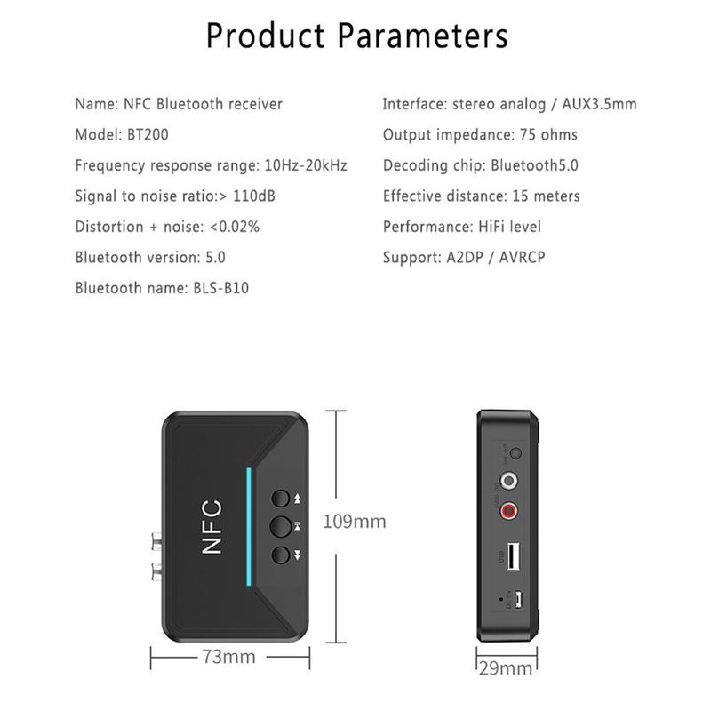 • BT200 NFC Bluetooth 5.0 Receptor de audio - Adaptador AUX 3.5mm y RCA con A2DP, alimentación USB, encendido/apagado automático para coche y estéreo doméstico (15 m de alcance)