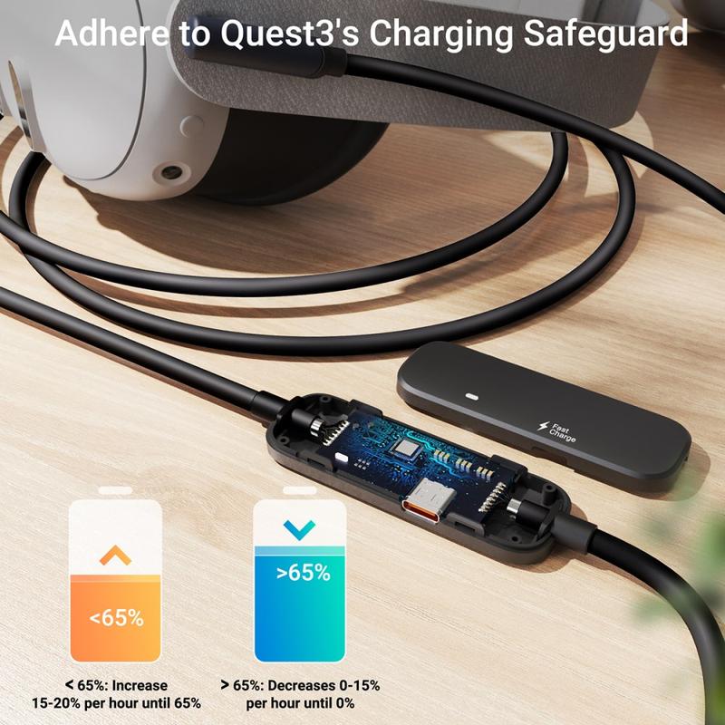 Diseñado para el movimiento activo, la longitud del cable te ofrece más libertad en el juego a escala de habitación, y una correa de velcro ayuda a mantener el cable organizado y reduce los tirones accidentales. Un chip de seguridad mejorado está diseñado para seguir el comportamiento de carga de Quest, reduciendo la potencia de carga cuando el nivel de la batería está por encima del 65 %, lo que ayuda a mantener el buen estado de la batería. La funda de PVC, más gruesa y flexible, está fabricada para soportar flexiones frecuentes y juegos de alta movilidad.