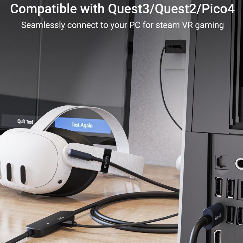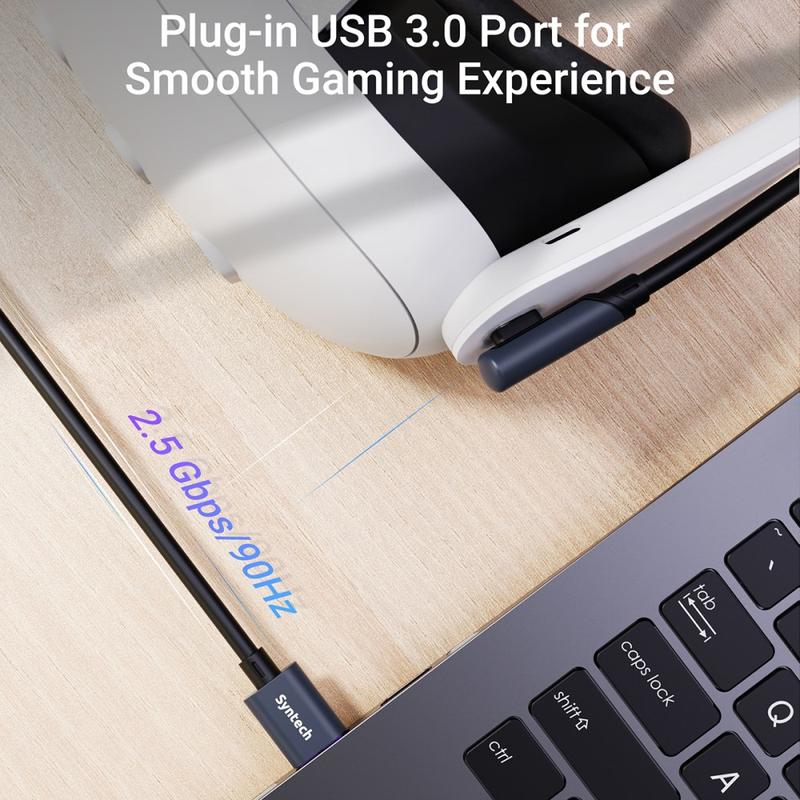 Juega más tiempo en realidad virtual sin preocuparte por el consumo de batería. El Syntech M32C1-5 es un cable de conexión VR de 5m diseñado para Meta Quest 3S, Quest 3 y Quest 2, que combina datos USB 3.0 de alta velocidad con un puerto de carga dedicado de 18 W. Esto te permite mantener una conexión por cable estable con tu PC para PCVR mientras cargas las gafas al mismo tiempo, para que puedas seguir jugando durante sesiones prolongadas.