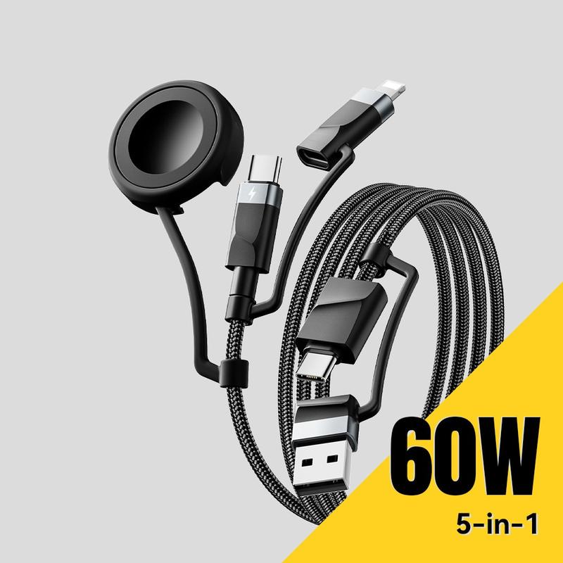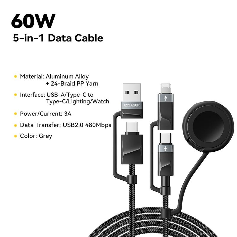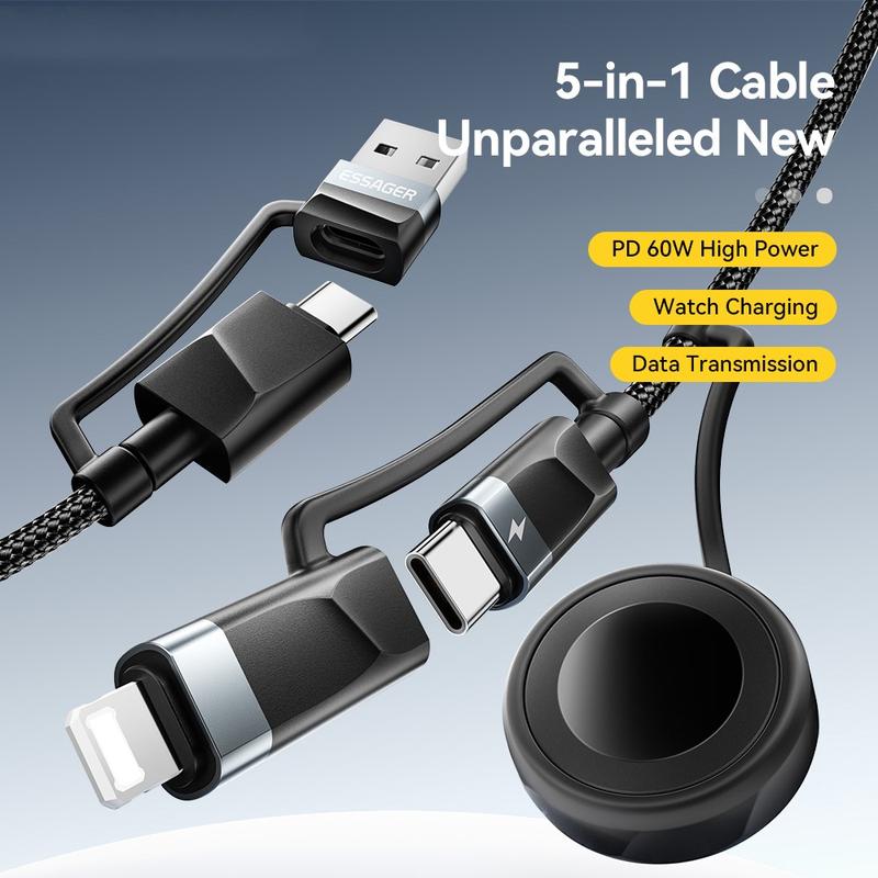 • Cable de carga rápida Essager 5 en 1 de 1m: cable de carga múltiple PD de 60 W con conectores USB-C, Lightning, USB-A y Apple Watch, sincronización de datos a 480 Mbps