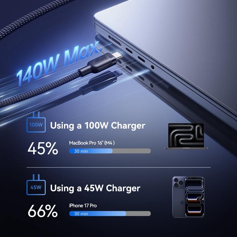 - La carga USB-C de 140 W se asocia comúnmente con los nuevos estándares de carga de alta potencia para portátiles bajo PD 3.1