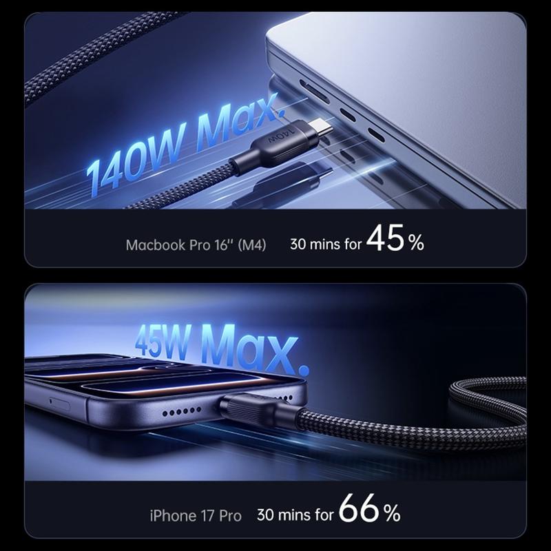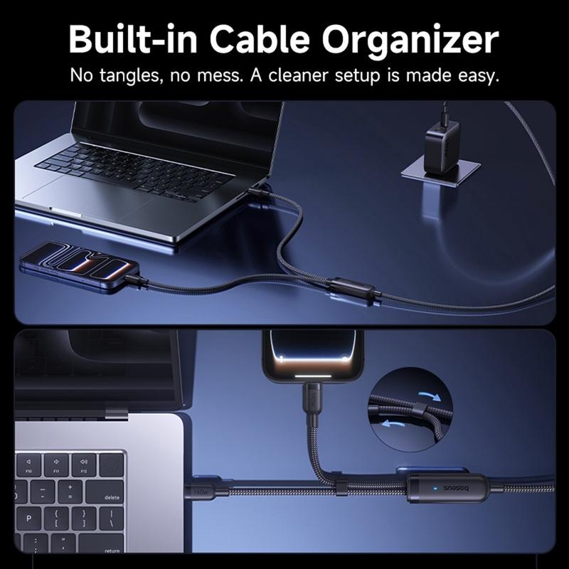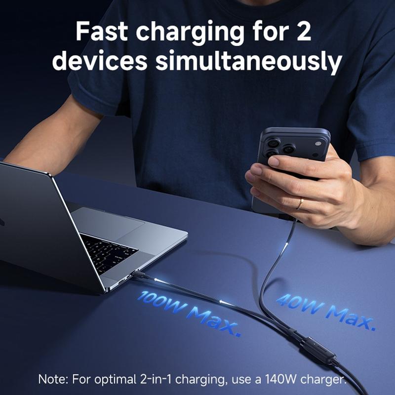 Carga dos dispositivos con un solo cable gracias al cable de carga rápida 2 en 1 BASEUS Flash 4. Diseñado para los dispositivos USB-C modernos, este cable de carga inteligente combina una alta potencia de salida, una amplia compatibilidad y una práctica gestión del cable en una solución ideal para viajar. Admite hasta 140 W de potencia máxima para la carga de un solo dispositivo y también puede distribuir la energía de forma inteligente entre dos dispositivos al mismo tiempo, lo que lo hace ideal para portátiles, tabletas, teléfonos, consolas portátiles y mucho más.