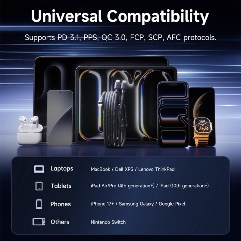 - Compatible con muchos dispositivos USB-C, incluidos MacBook, Dell XPS, Lenovo ThinkPad, iPad, iPhone de las series 15/16/17, Samsung Galaxy, Google Pixel y Nintendo Switch