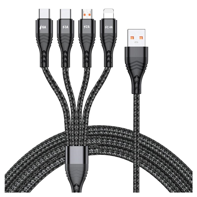 Este cable universal 4 en 1 trenzado de nailon cuenta con un conector Lightning, un microUSB y dos conectores tipo C en un extremo. Con una potencia máxima de salida de 66W y con soporte de carga rápida. En cada conector está marcada la potencia de salida máxima, 6A USB-C, 3A USB-C, 2.4A Lightning y 2A microUSB.