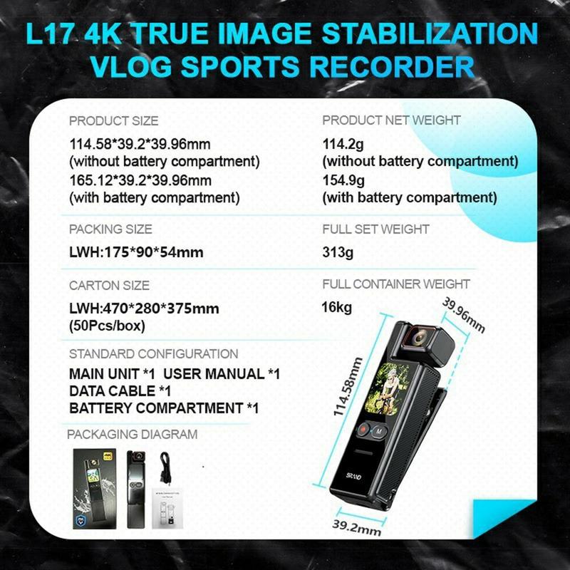 Para mantener la estabilidad de las imágenes, la L17 utiliza un sistema de estabilización con giroscopio de 6 ejes con 3 niveles ajustables, lo que ayuda a reducir las vibraciones durante el movimiento. La pantalla táctil TFT de 1.69 pulgadas facilita los controles y las previsualizaciones, y el WiFi integrado permite transferir archivos y controlar la cámara a través de una aplicación para smartphone. El almacenamiento también es flexible, ya que admite tarjetas U3 de alta velocidad de hasta 512 GB. La tarjeta de 64GB y el lector de tarjetas incluidos te permiten empezar a grabar de inmediato. Un clip magnético y una montura de tornillo de 1/4" añaden opciones de montaje adicionales para entrenamientos, ciclismo o viajes.