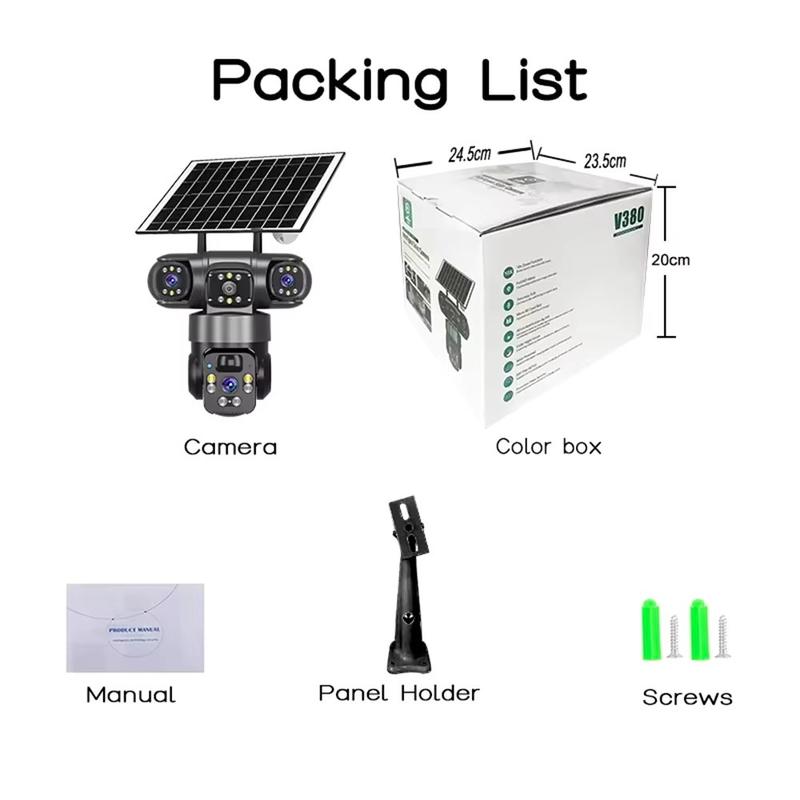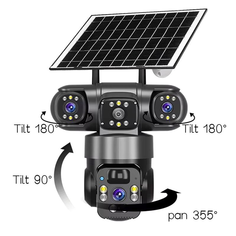 Cubra más espacio con menos puntos ciegos utilizando la cámara de seguridad PTZ solar V380 Pro de 3 lentes. Diseñada para la vigilancia en exteriores, combina dos lentes fijas con una lente PTZ giratoria, lo que le permite mantener a la vista las zonas clave y, al mismo tiempo, poder girar e inclinar la cámara de forma remota cuando sea necesario observar algo más de cerca. La resolución 2K (2560 1440) y la compresión H.265 ofrecen detalles nítidos y ayudan a reducir el uso de almacenamiento en comparación con formatos anteriores.