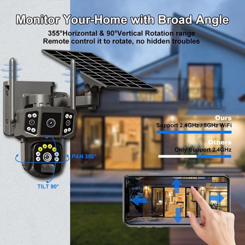 Cámara de seguridad WiFi solar para exteriores QL18 con doble lente 2K (2560 x 1440) - PTZ 355/90, visión nocturna a todo color, detección AI+PIR/radar, audio bidireccional, IP66, H.265