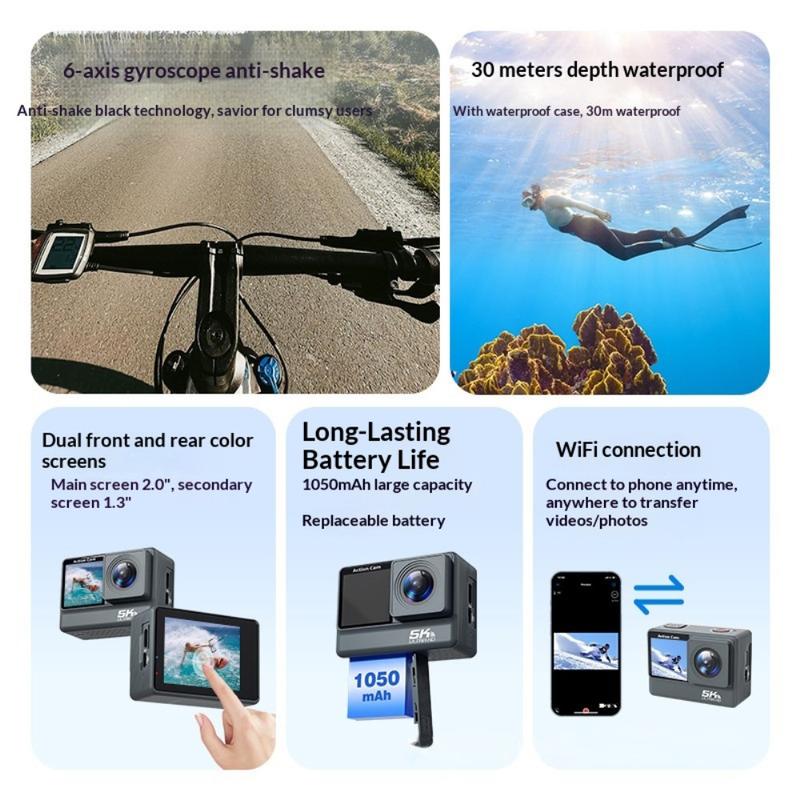 Cámara de acción con doble pantalla F308AATR: cámara deportiva HD 5K con estabilización de 6 ejes, WiFi y carcasa impermeable