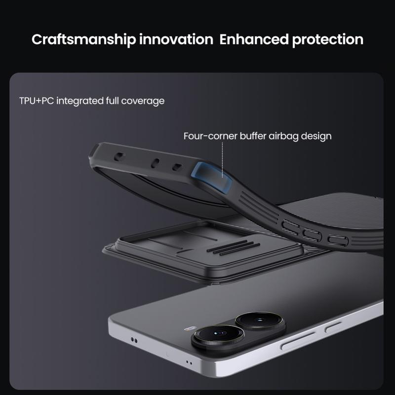 - Este extraordinario estuche híbrido Nillkin CamShield Prop está hecho de plástico y materiales de TPU