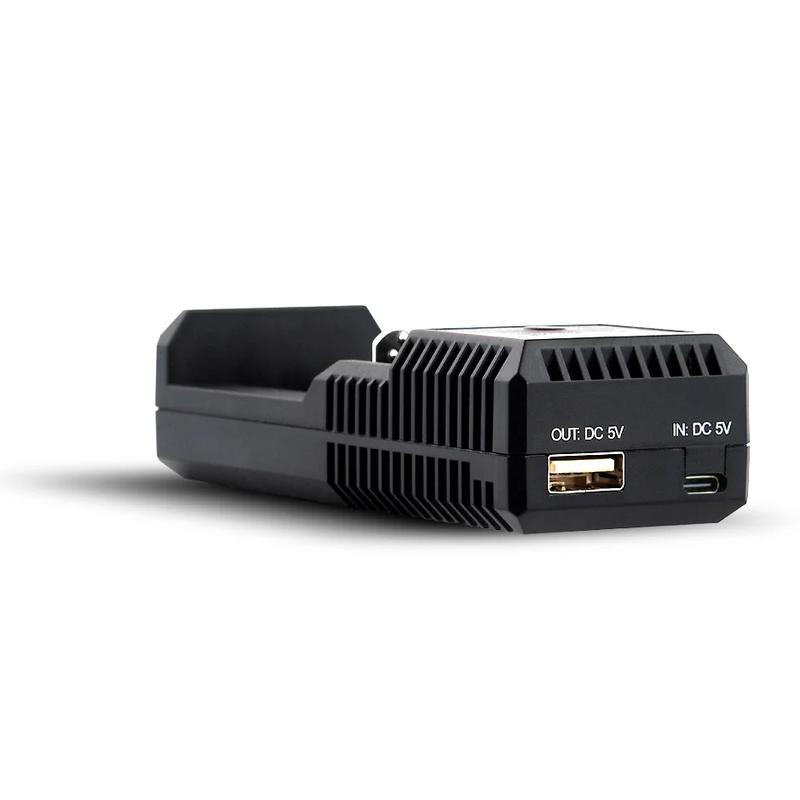 - Función de banco de energía - con cualquier célula de iones de litio (por ejemplo, 18650, 20700, 21700) funciona como un banco de energía USB portátil (5V/1A, máx. 1,5A).
