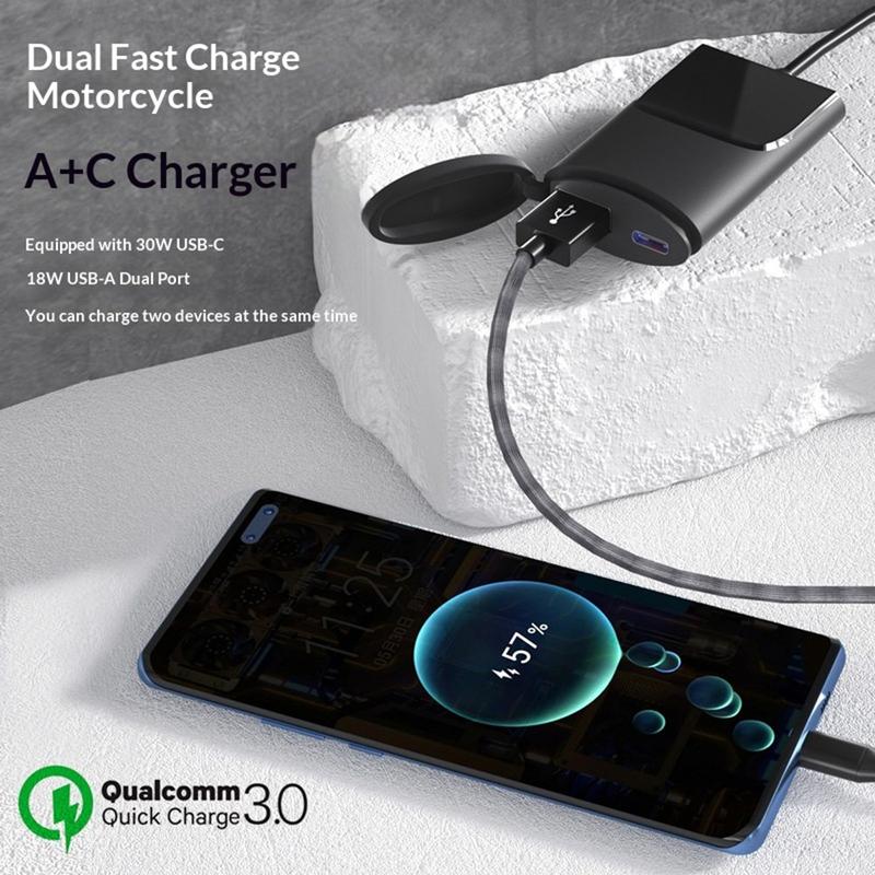 Con un puerto USB-C PD de 30W y un puerto USB-A de 18W, este cargador admite la carga rápida para una amplia gama de dispositivos y te permite cargar dos dispositivos al mismo tiempo. Su construcción resistente al agua con clasificación IP67 y su protección de seguridad integrada lo convierten en una opción fiable para la conducción diaria y el uso al aire libre en condiciones climáticas cambiantes.