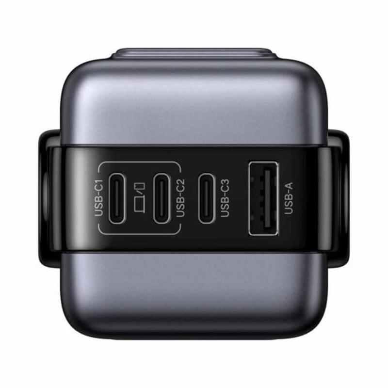 - Cuatro puertos de carga (3× USB-C + 1× USB-A) para alimentar hasta cuatro dispositivos simultáneamente