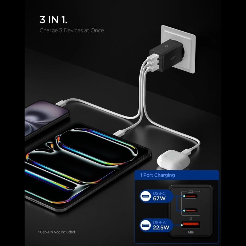 Cargador de pared de 3 puertos Spigen Essential EE673EU - Cargador rápido GaN Pro de 67W con doble USB-C y USB-A.