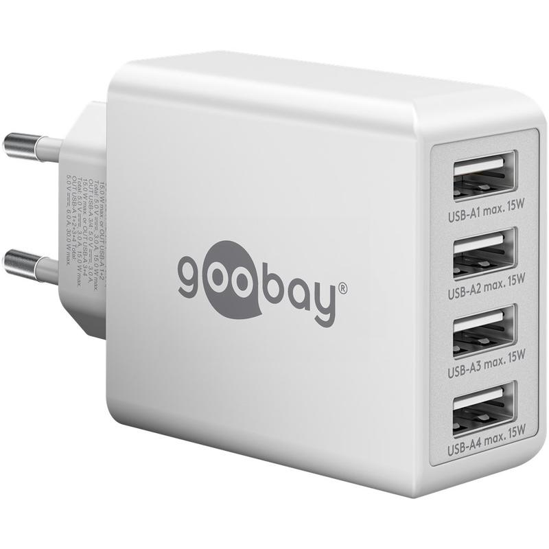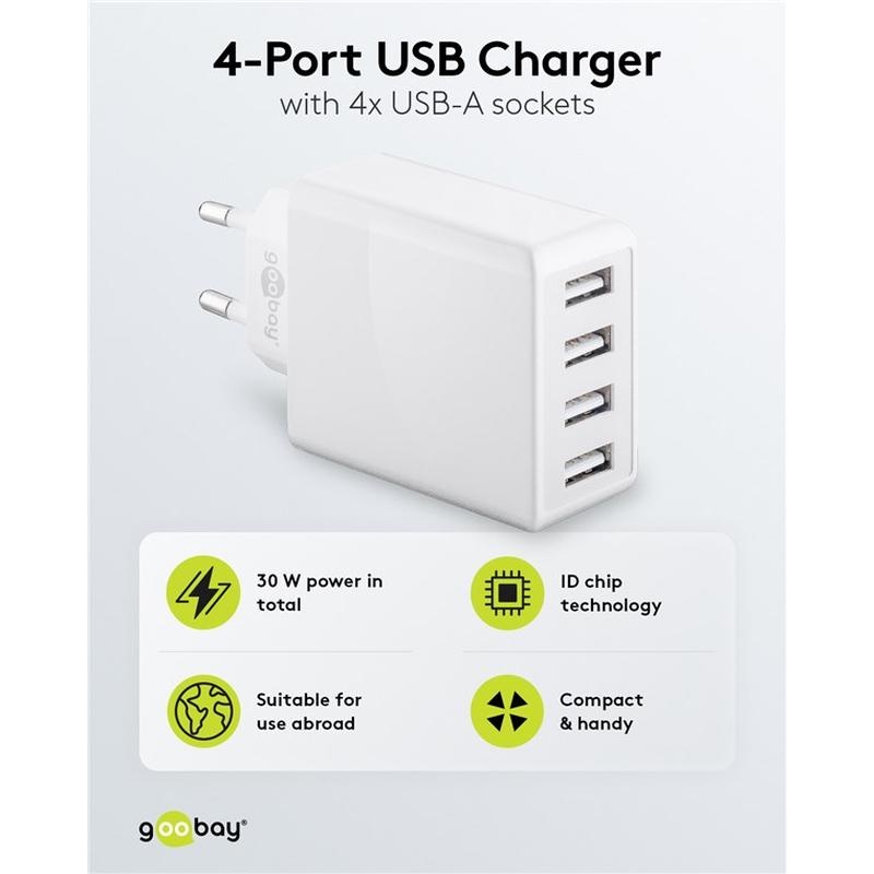 Cargador de pared Goobay 30W 4x USB-A: adaptador de pared de 4 puertos con detección inteligente de carga
