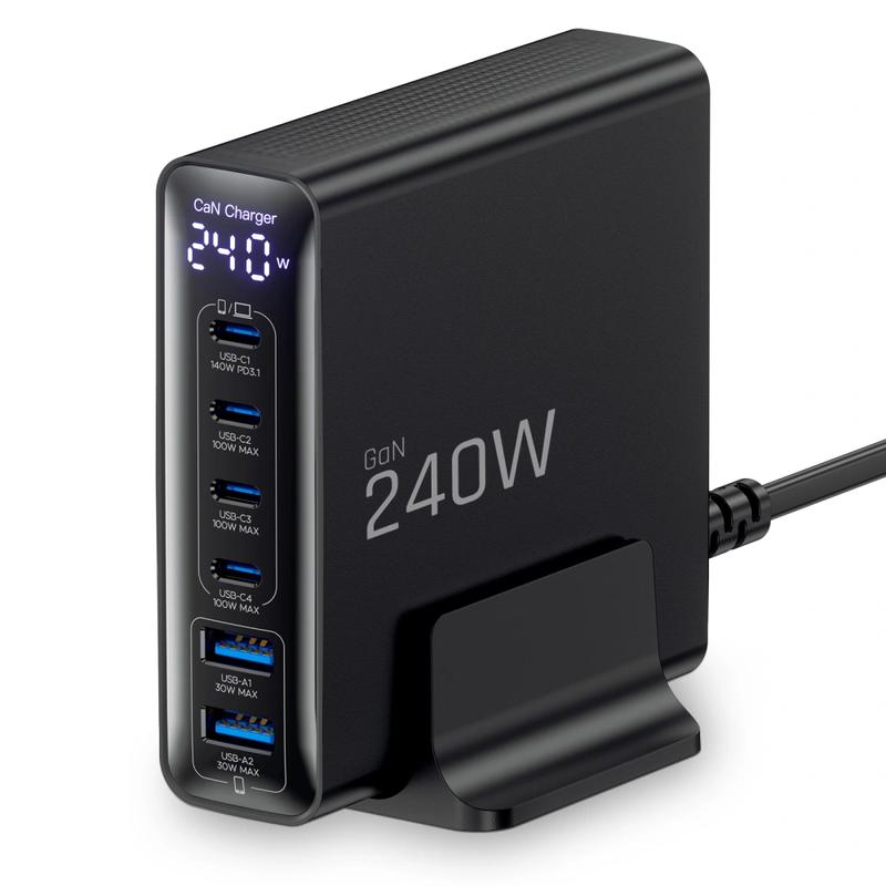 Alimenta todos tus dispositivos desde un solo lugar con el cargador de sobremesa Tech-Protect DC240W-GaN. Diseñado para entornos de trabajo exigentes, este cargador de alto rendimiento cuenta con 6 puertos —4 USB-C y 2 USB-A— con una potencia de salida total de hasta 240 W, lo que lo hace ideal para portátiles, tabletas, teléfonos inteligentes y otros dispositivos de uso diario.