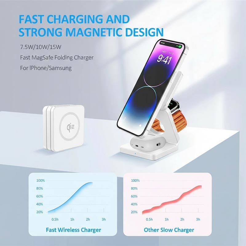 • Soporte de carga inalámbrico magnético plegable Qi2 15W 3 en 1 - para iPhone, Apple Watch y AirPods