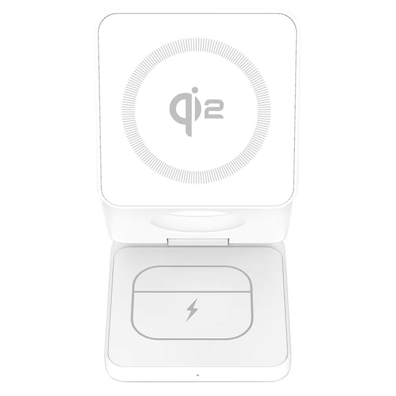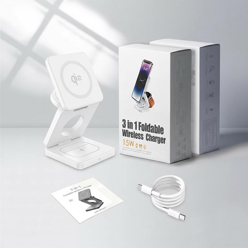 Cargador inalámbrico magnético plegable Qi2 15W 3 en 1 - Blanco