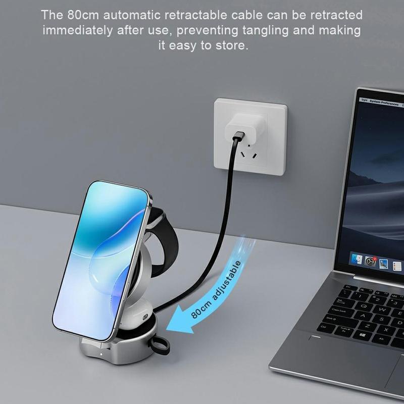 • Cargador inalámbrico magnético plegable 3 en 1 B30 - Base de carga rápida Qi2 de 15W con cable USB-C retráctil de 80 cm para teléfono, reloj y auriculares