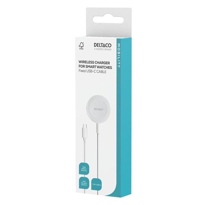 Mantén tu reloj inteligente cargado fácilmente con este cargador inalámbrico portátil de Deltaco para Apple Watch y Samsung Galaxy Watch. Diseñado para facilitar el día a día, se conecta mediante el cable USB-C fijo de 1 m y ofrece una solución de carga sencilla en casa, en el trabajo o durante los viajes.