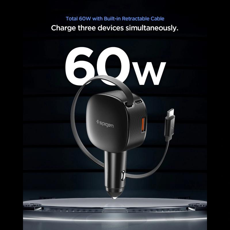 Cargador esencial para coche Spigen EV603BT: carga rápida de 60 W con cable USB-C retráctil y puertos USB-C y USB-A.