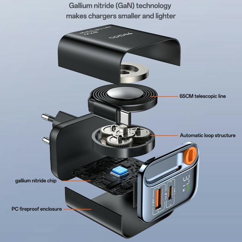 Cargue de forma más inteligente y rápida con el cargador rápido YESIDO YC100 67W GaN, una solución compacta y eficiente diseñada para los dispositivos modernos. Equipado con dos puertos, tecnología avanzada de nitruro de galio (GaN) y un cable retráctil integrado, combina potencia, comodidad y seguridad, y es perfecto para el hogar, la oficina o los viajes.