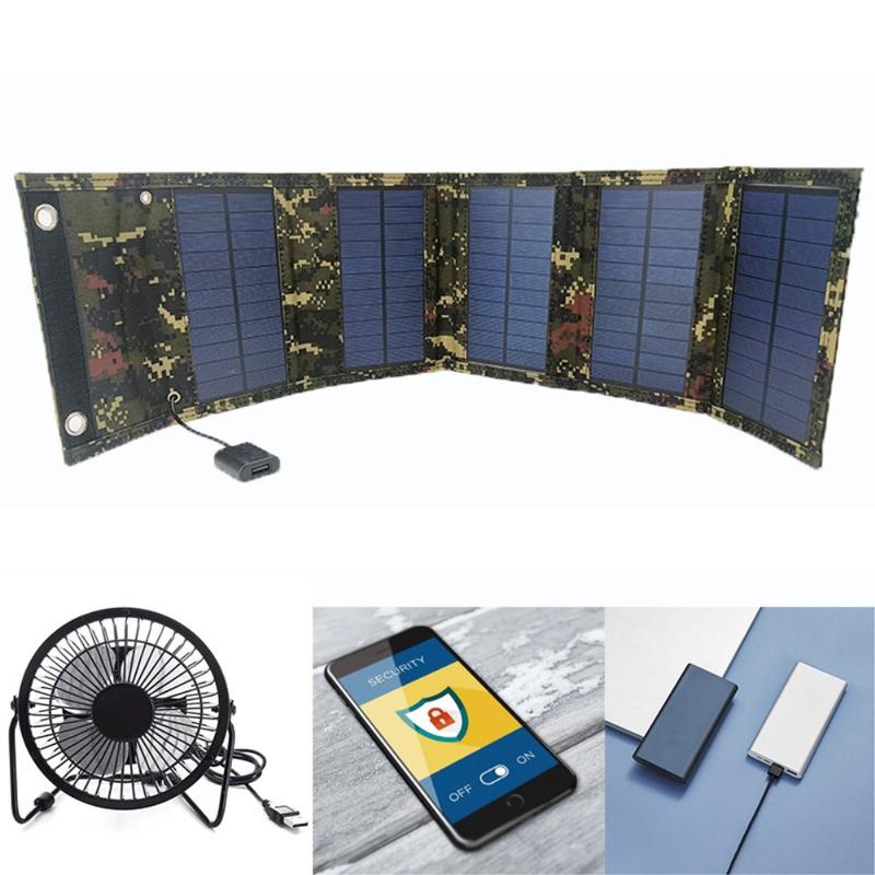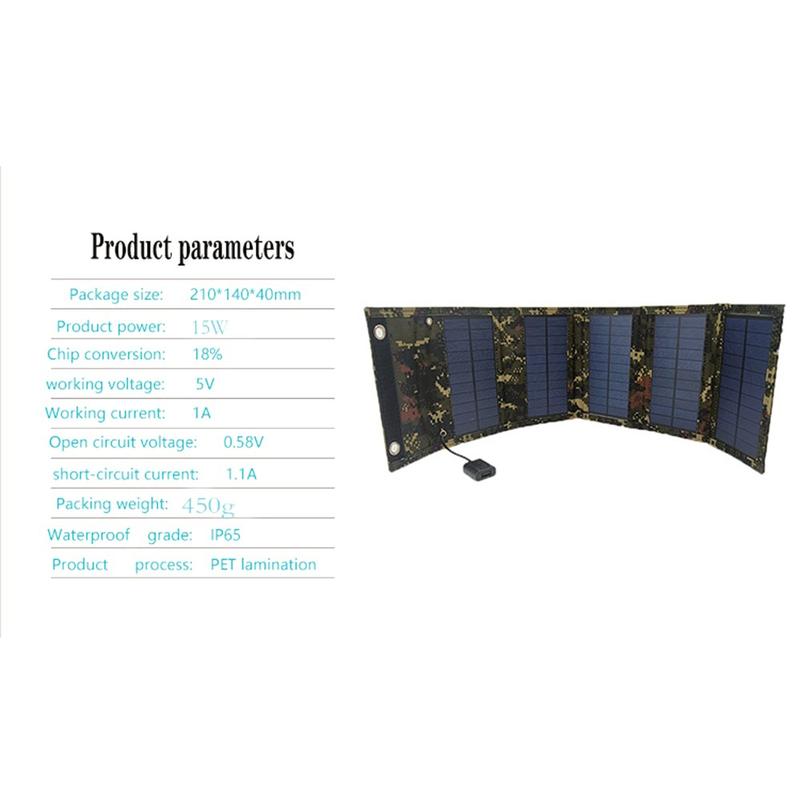 - Cargador solar plegable de 15W con 5 paneles para mejorar la superficie y la portabilidad