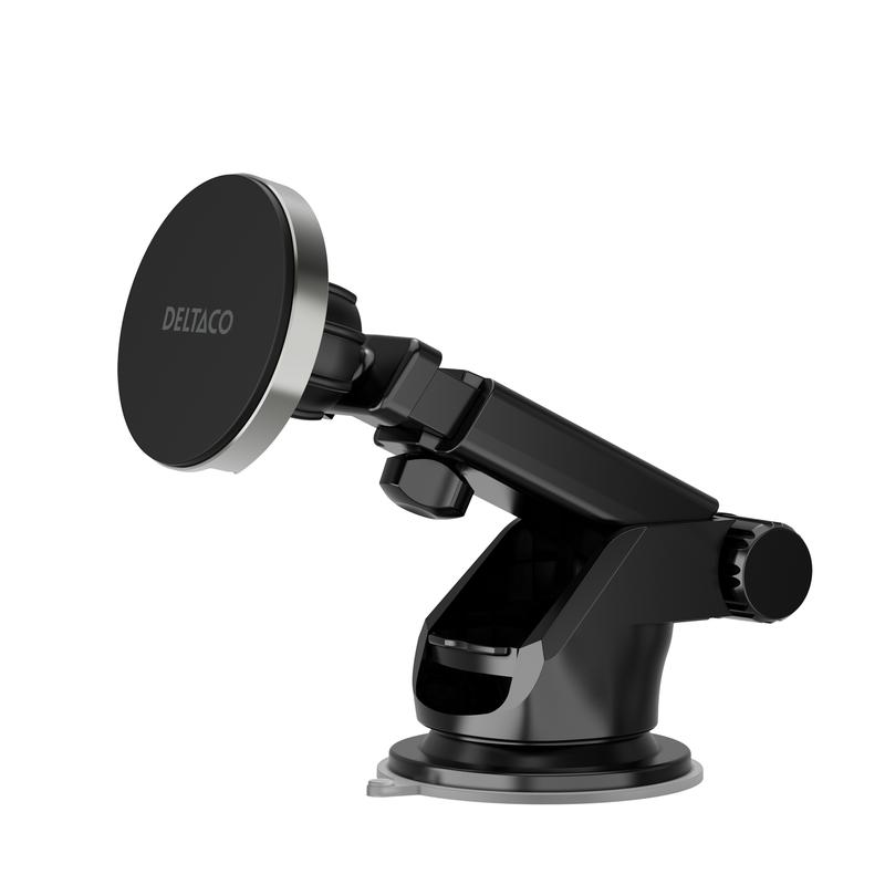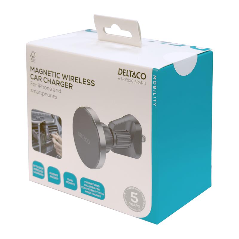 • Cargador inalámbrico magnético desmontable para coche Deltaco - Soporte para móvil Qi2 de 15W con fijación para la rejilla de ventilación y ventosa